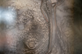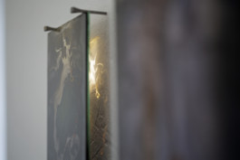 Ces peintures à la suie de bougie figent le mouvement du feu. L’encre brûlée dépose un motif aléatoire sur le verre qui traversé par la lumière dévoile une image unique.