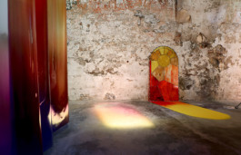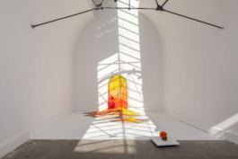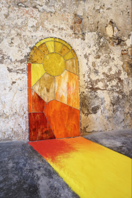 Vitrail solaire créé in situ pour la chapelle de la Madeleine de Arles. Dans ce lieu il était présenté derrière un grand rideau imprimé dont le motif enflammé immergeait le spectateur. La vraie projection lumineuse de la fenêtre de l’espace était teinté par un filtre coloré et venait correspondre avec le vitrail à l’heure de midi.