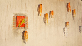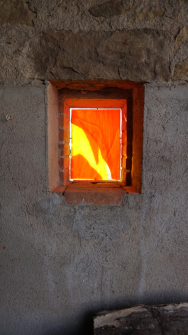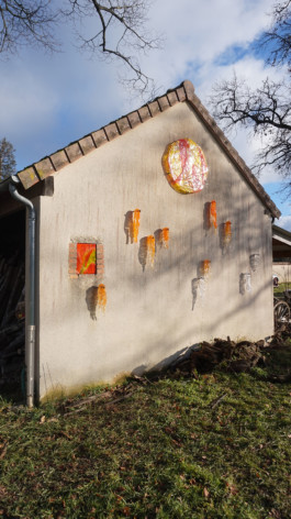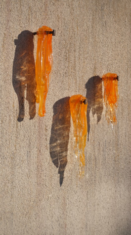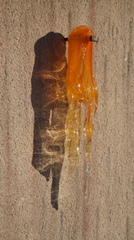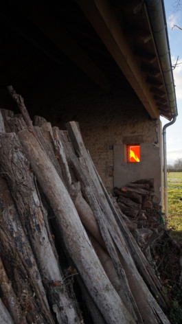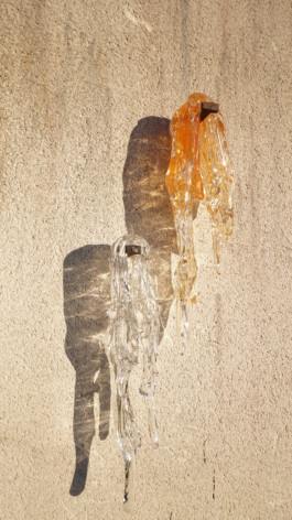 Installation réalisée pour le domaine Fertile à Toury-sur-jour en Bourgogne. Après une résidence d’immersion sur ce domaine mariant plusieurs corps de bâtiments, culture et forêt, les sculptures ont pris place sur la façade la plus proche de l’entrée. Ayant la forme symbolique de la maison et faisant le lien avec l’extérieur, cette façade est habitée par deux vitraux donnant à voir la présence du feu : source première de notre lumière naturelle, celle du soleil ; et élément indispensable à la fertilisation des sols. Émanent de ce mur cristallisant la lumière, dix coulées de matière entre sève et fantôme. L’installation donne à voir une scène figée s’animant par ses reflets et fonctionnant ainsi comme un cadran solaire.